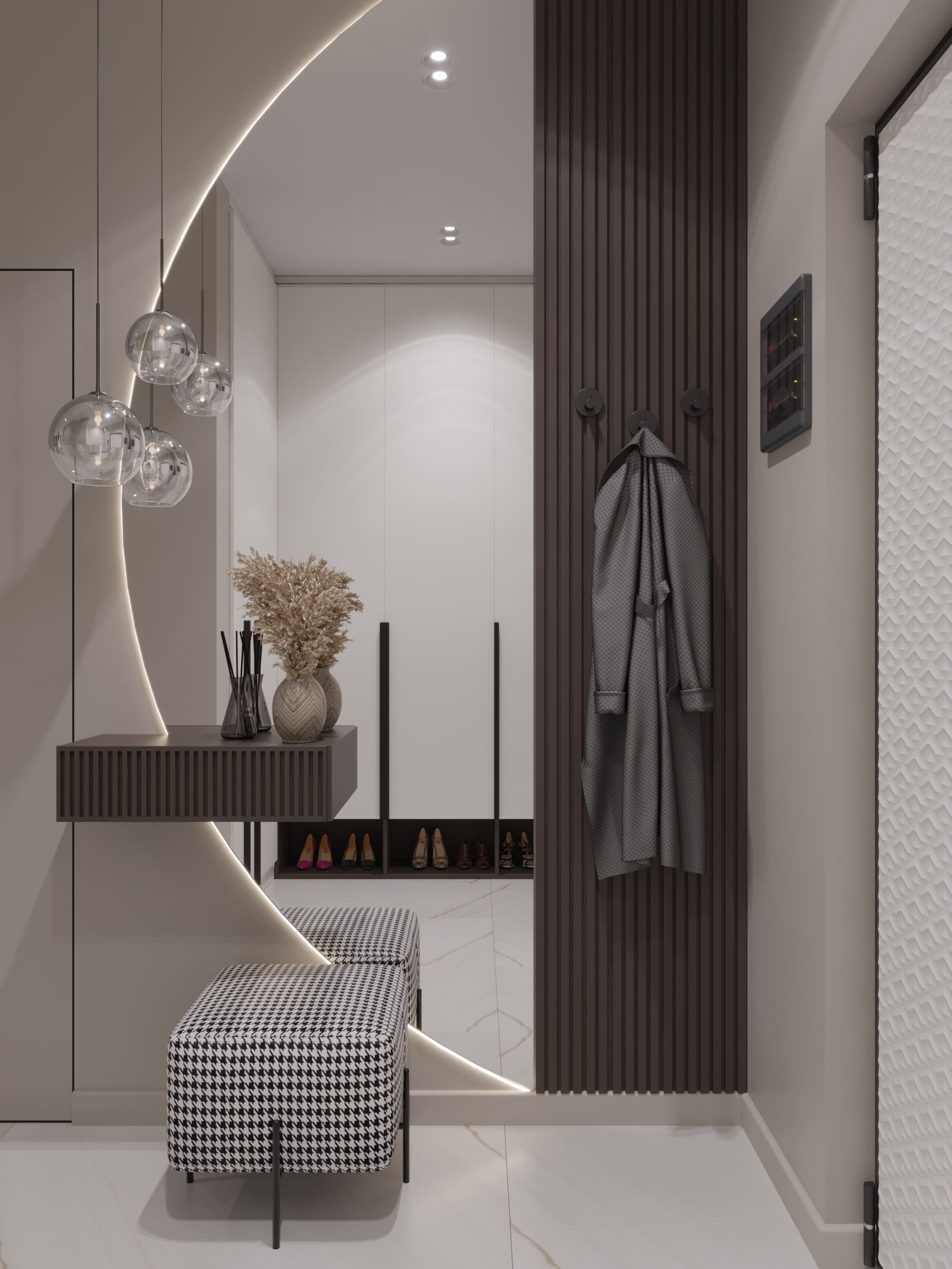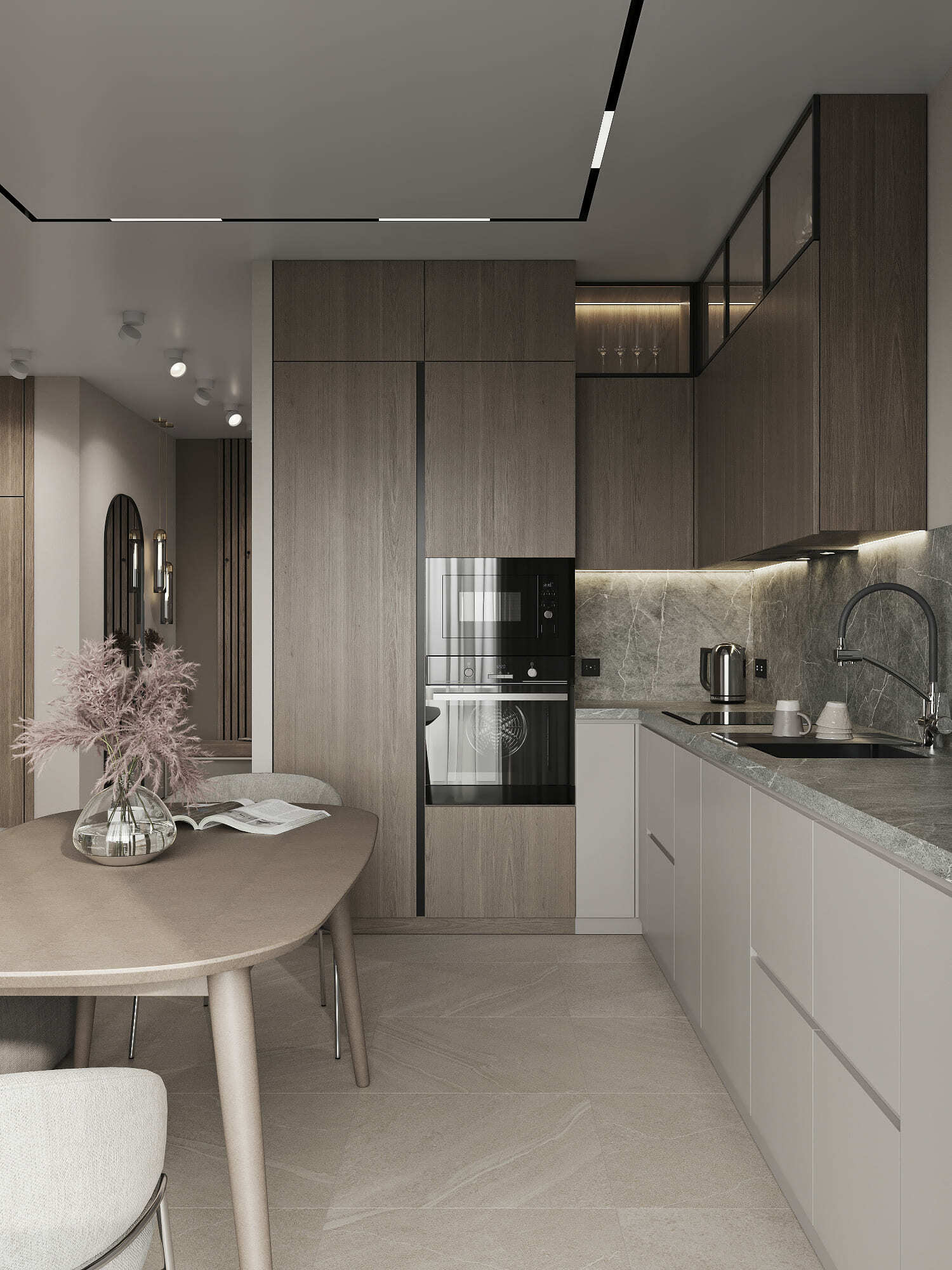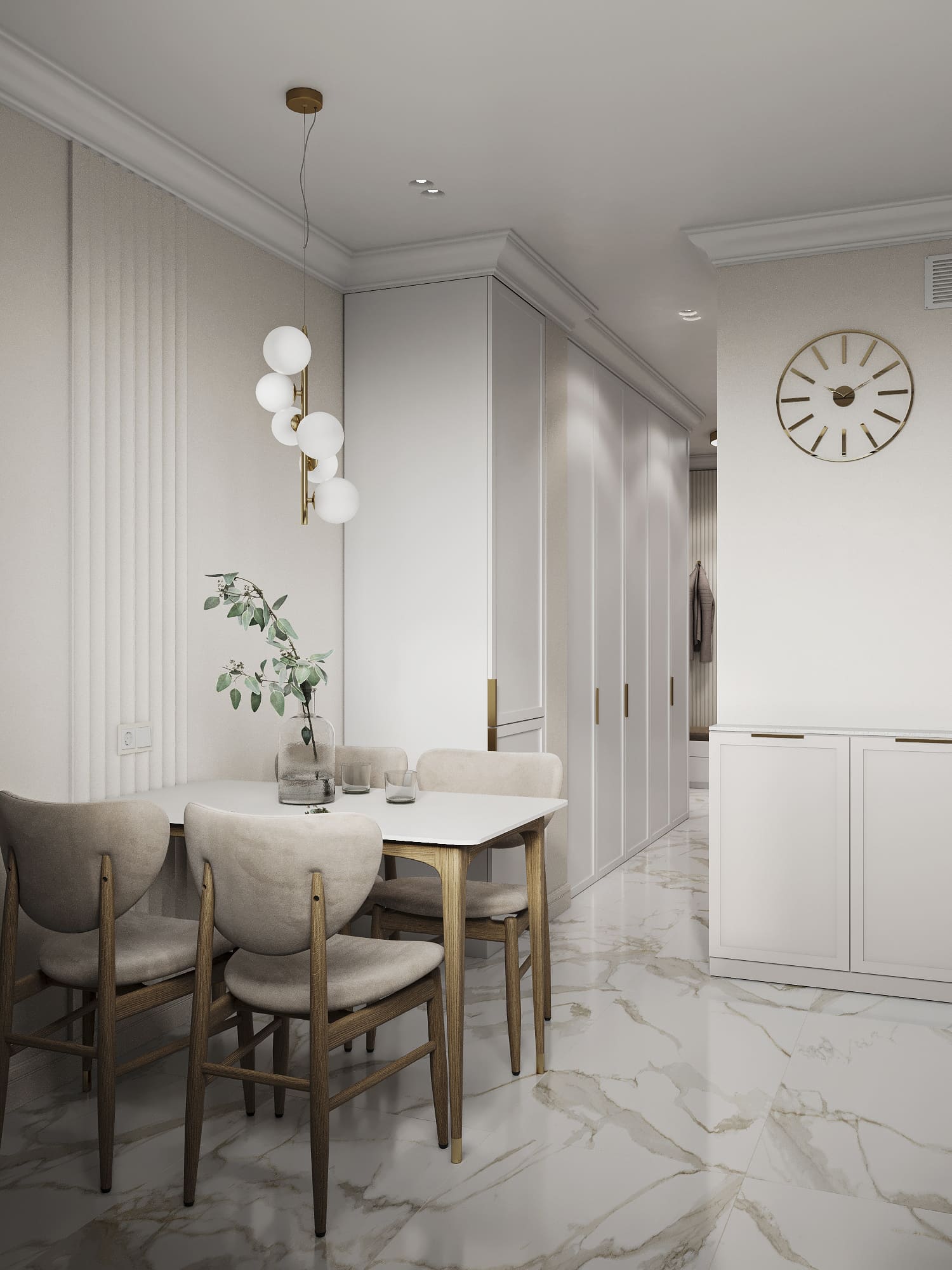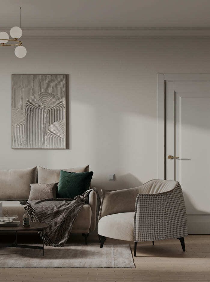 Я оставила стилеобразующие элементы американской классики (форма мягкой мебели, торшеры, черно-белые фото на стенах, фигурный потолок), но цветовое решение, а также различные хитрости типа фрезеровок, изящной мебели на тонких ножках и т.п., добавили в интерьер легкости и современности